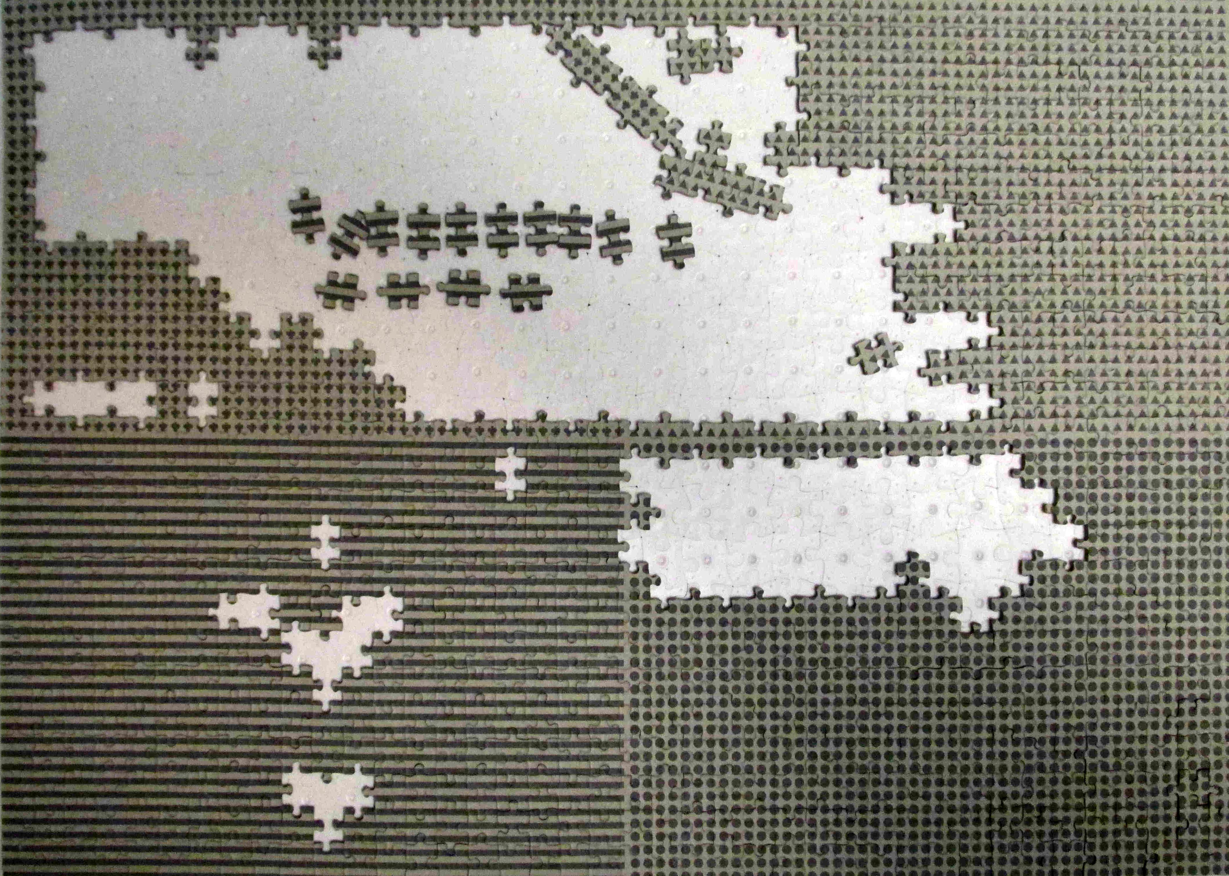 Для начала вид коробки: Собирать этот пазл было немного легче, чем предыдущий. Очень помогало то, что на оборотной стороне пазлин были нанесены геометрические фигуры. Их было 4 вида, поэтому пришлось собирать не один на 1000, а как бы четыре по 250. К сожалению, поняла это не сразу. Однажды случайно посмотрела на нижнюю сторону коробки, а там все это показано. Правда, приходилось довольно часто переворачивать части пазла, чтобы убедиться, что все собрано верно, а это было очень нелегко - сцепки - никакой. Но зато сразу было видно, где напортачила.