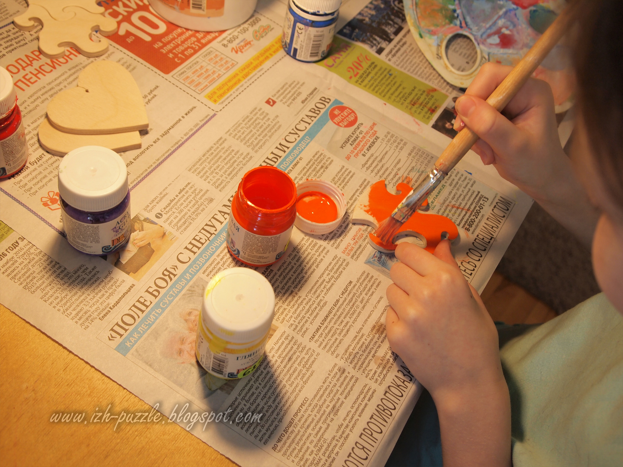 Развлекались с семилетней дочкой, сделали пазлик на конкурс валентинок. За мной - резка, за ней - цвет. Размер примерно 18*15см, 13 деталей, акриловая краска.