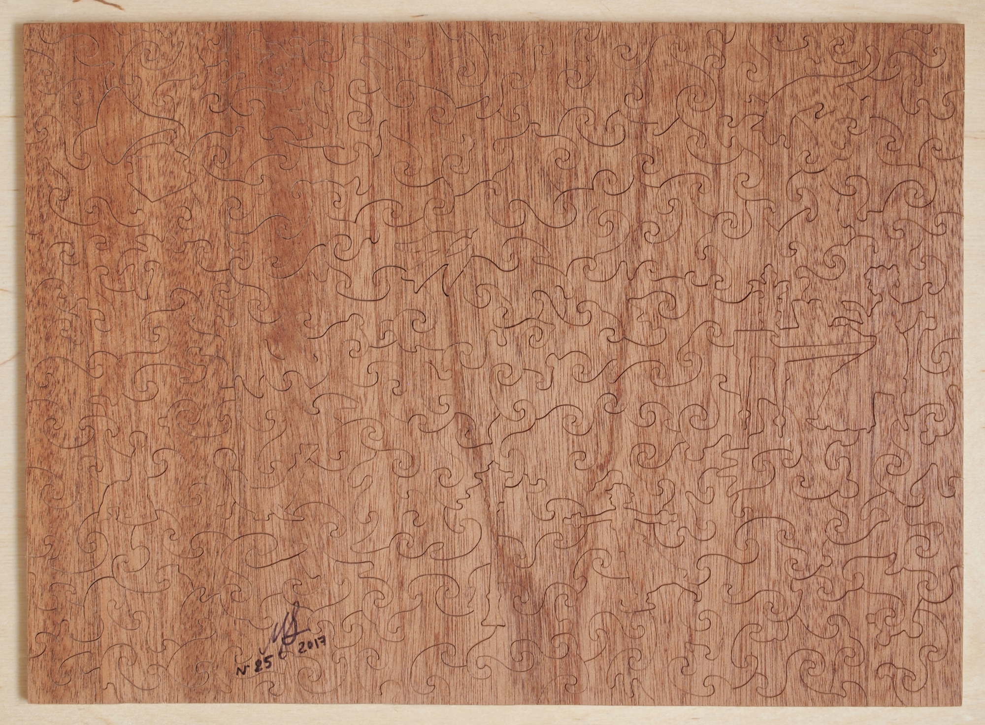 В перерыве между основными заказами решил попробовать кое-что новое. Результатом эксперимента стал пазл, выполненный из фанеры, облицованной с обратной стороны шпоном красного дерева, точнее - сапеле. Как мне кажется проба вышла весьма удачной. Фотографии просто не могут реально передавать игру переливов света на текстуре древесины.