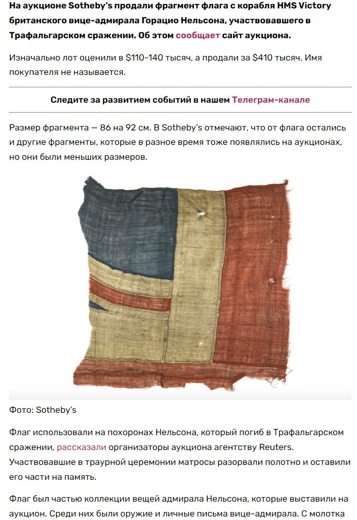 Продолжаем ставить точки: Юнион Джек на красном фоне - это флаг Британских торговых судов, на военных он на синем полотне флага, но почему здесь так я не знаю (кстати на литографии из предыдущего комента он как раз на синем изображён) - пересмотрел кучу картинок морских баталий - там разобраться невозможно, а может это и вообще всё от воли художника зависит - они шли в бой и с синим и с красным и просто с Джеком во всю спину, может от года зависит - кто в данное время на престоле сидел, не знаю pardon ...факт в том, что когда Вика снялась с хранения и пошла воевать флаги на ней были как на картинке нашей (на мачте вверху красный вымпел вероятно обозначает, что это корабль флагман), а при Трафальгаре на ней однозначно тоже был Джек на красном фоне, чай за подделку 410 тысяч грина никто бы платить не стал wacko ...