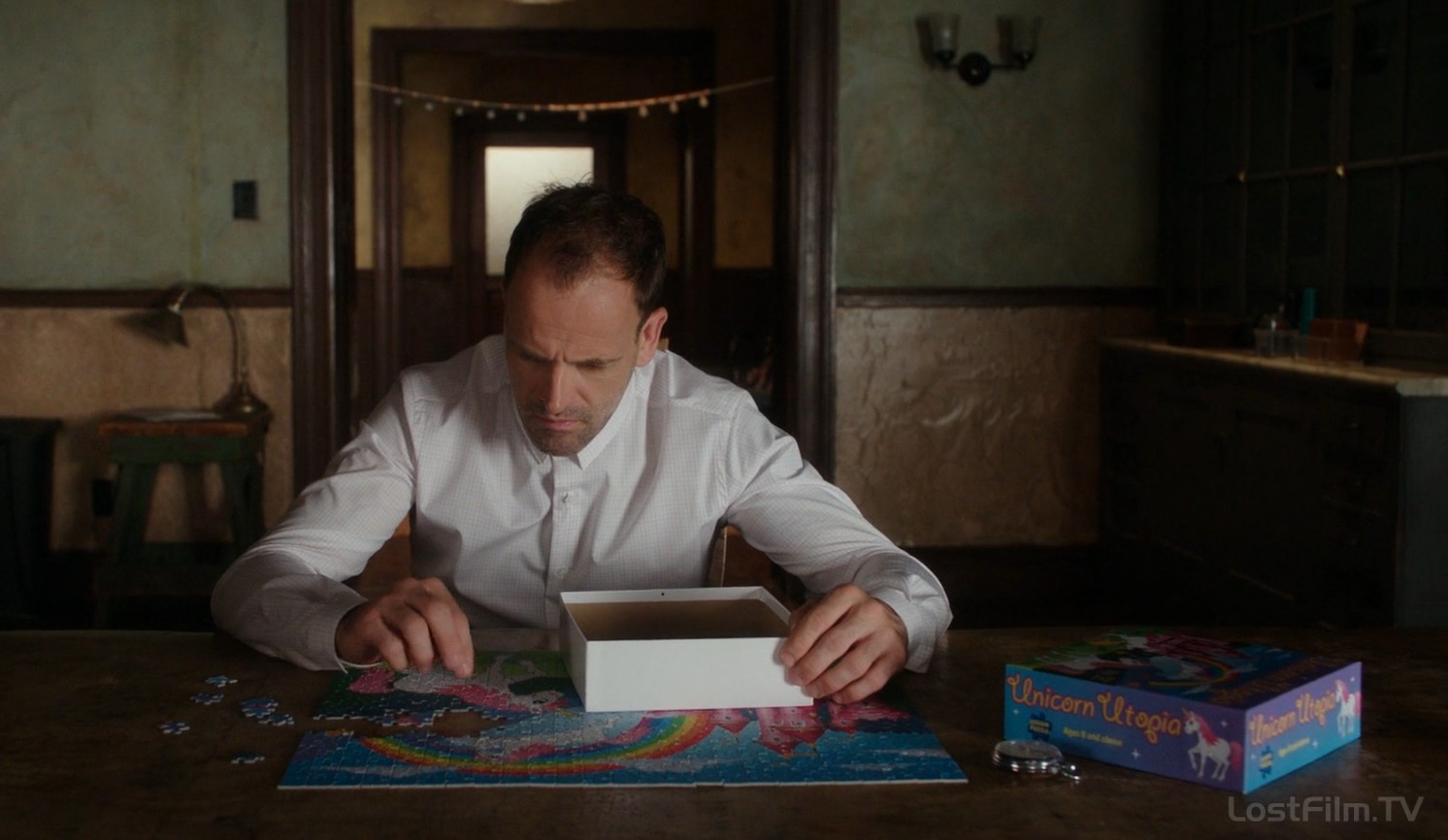 там по замыслу сценариста часть пазла лежит, по-моему одну детальку он даже от туда доставал приподнимая коробку )) хотя очевидно что пазл был собран и очень топорно с краю отковыряли небольшой участок, оставив одну деталь из рамки не установленной, можно сказать почти киноляп )