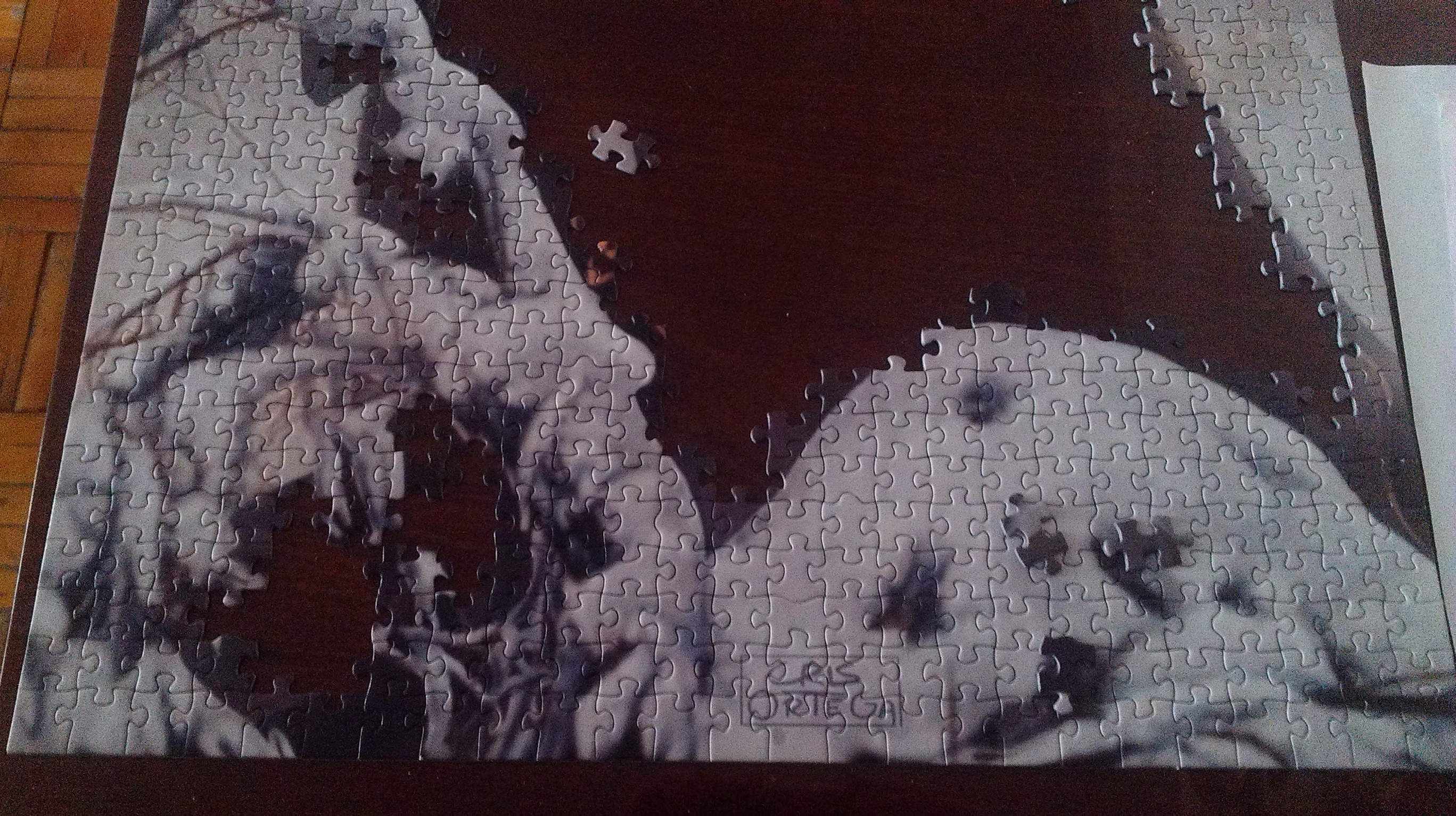 Прочитав, просчитав и немного обалдев от размера пазла, решил, что как раз на раскладной большой стол он вполне так поместится. Чтобы в этом удостовериться, да и просто потому, что люблю собирать сначала рамку... правильно. Собрал рамку: Решив не стандартно подойти к началу сборки, собрал девушку. Не всю. Исключительно чтобы поговорить во время остального, как я думал, достаточно скучного сбора фона. Фото: После двух дней перерыва, настал: