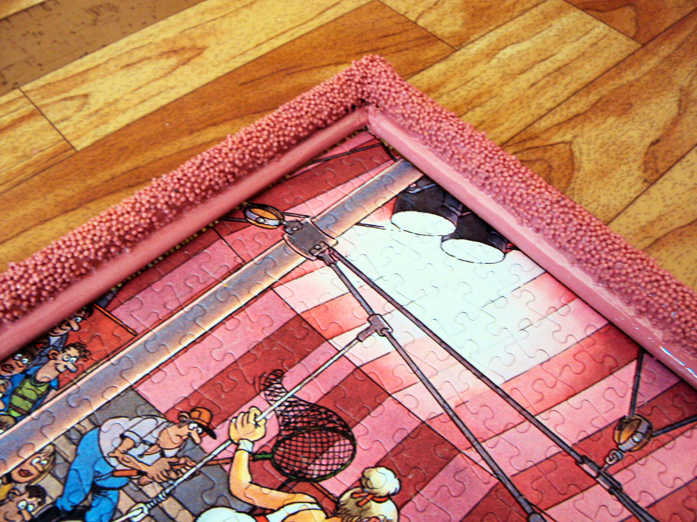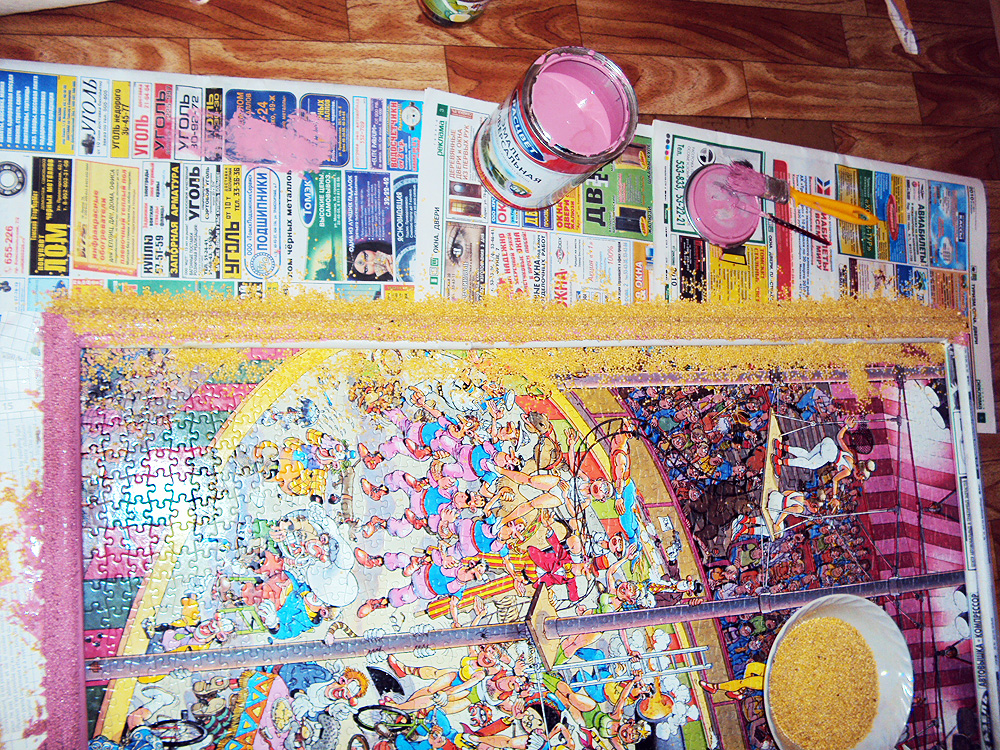Брат у меня рекламщик идля переворачивая пазла предложил использовать монтажную самоклеющуюся пленку. Наклеить ее на лицевую сторону пазла, переврнуть и с обратной стороны наклетить так называемую "защитку"