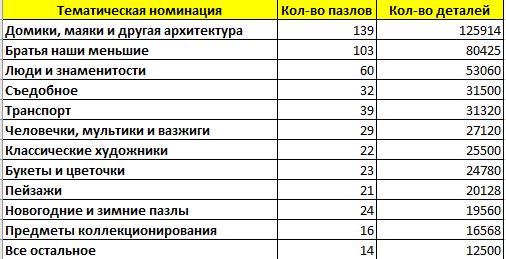 Однако изменения в десятке популярных брендов все же есть, что не могут нас не радовать. Шестое место в этом году занимает российский производитель Hatber, удививший нас взрывной волной красочных новинок и обогнавший столь популярных ранее Трефла и Хейку и уступивший всего лишь несколько тысяч итальянке Клементони. Другой наш российский производитель, Степ пазл, в этом году отдал одну строчку и спустился на девятую позицию. О да, новинки правят балом!
