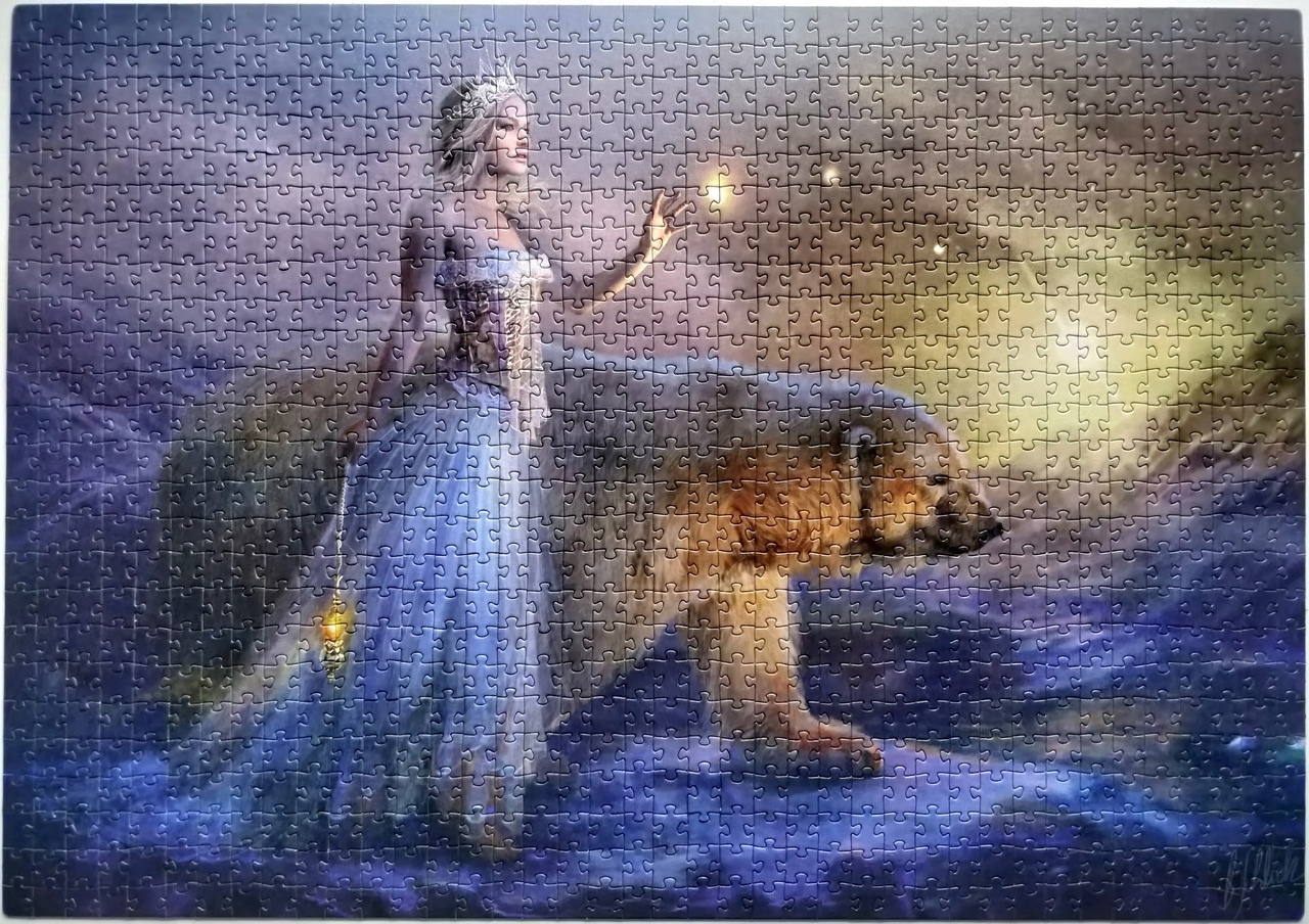 Приятный и несложный старый степчик с не менее приятной и обворожительной беловолосой девушкой под охраной косматого неповоротливого медведя. Собирался совершенно ненапряжно, небо почти как градиент, деталька за деталькой. Вот только с темным фоном внизу слегка поковырялась