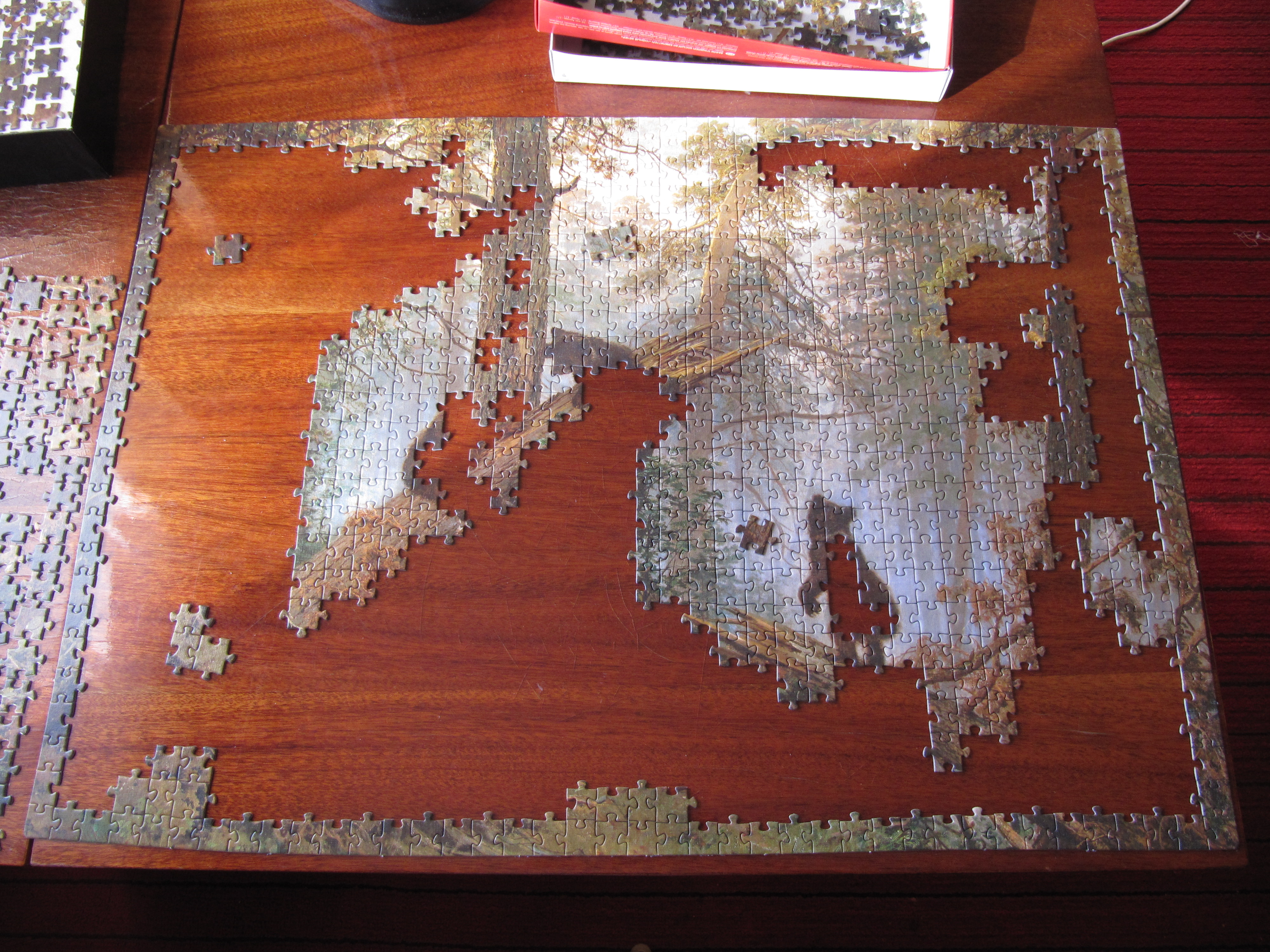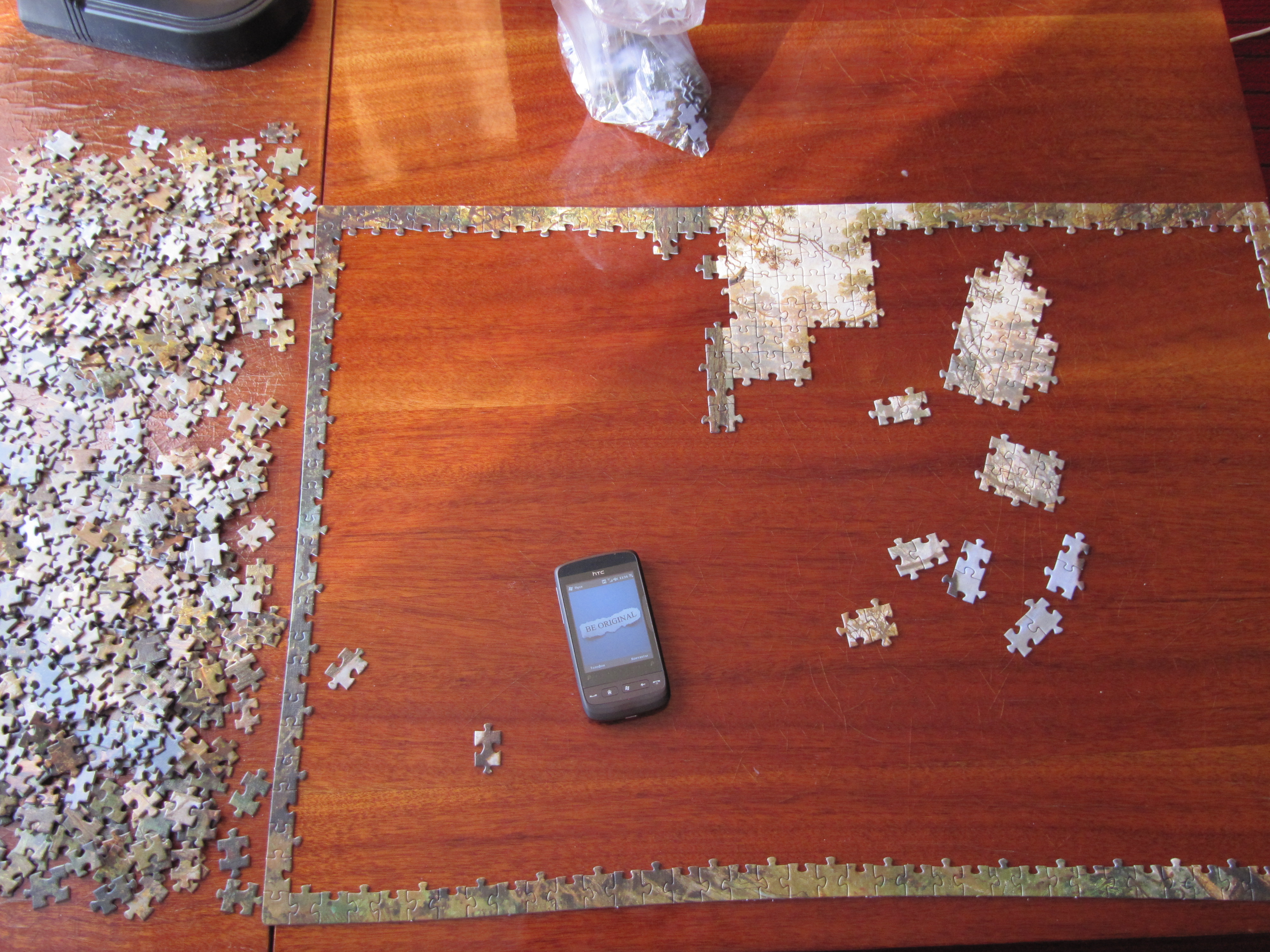 Пришлось собирать всю картину методом поиска. Делается это так. Берешь одну детальку и ищешь ее изображение на картинке. Если находишь то прикидываешь примерно где она должна стоять пазле и ставишь ее в то место. И так 1000 раз. Именно столько деталек в этом пазле.