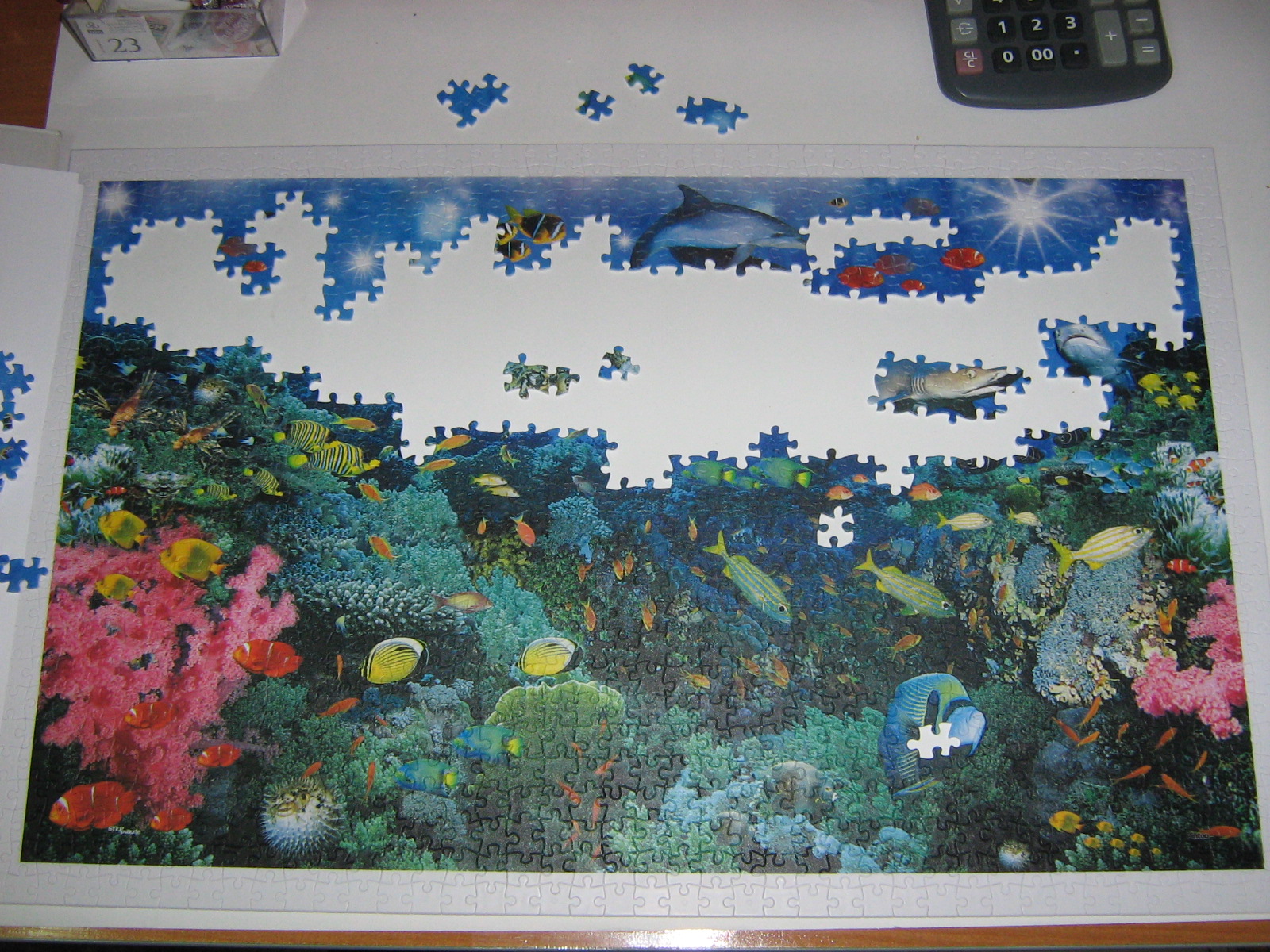 Начала сборку в понедельник. Минут за 5 собрала чудо-рамку из белых деталей. Мне так понравилось :)))) Потом за полчаса собрала красные водоросли и всё. Тупик. Психанула и разобрала его. Открыла Трефл на 1500. Господи, там все детали одного цвета. Ковыряла, ковыряла весь день. Еще больше бешенства и вдруг мысль "Ой, а пластик вроде легче был". Разобрала Трефл, достала пластик. И за три дооооолгих дня я одолела его :) Из минусов - маленький размер собранного пазла. Ну никак на 1000 не тянет. Скорее как 500 у Кастора. Из плюсов - это ПЛАСТИК! :)))) Прикольно.