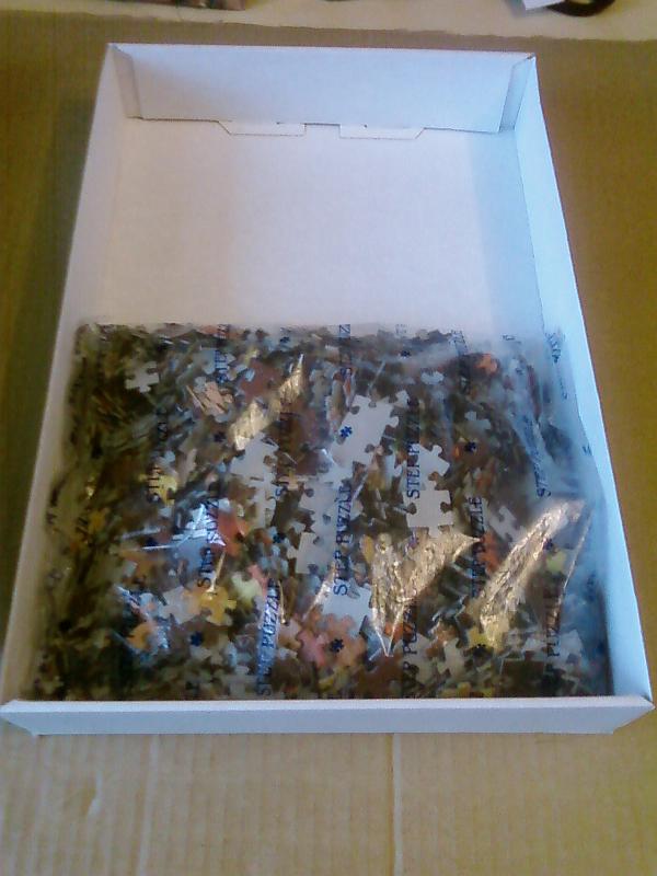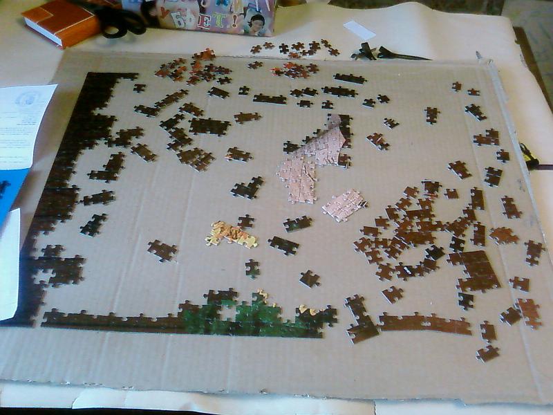 Пришлось собирать заново. И сразу садить на самоклейку. А сверху придется еще ПВА или лаком покрывать, потому что красочный слой такой хрупкий, что после всего двух сборок пазл выглядит обтрепанным как мои старички, раз по 5 собиравшиеся.