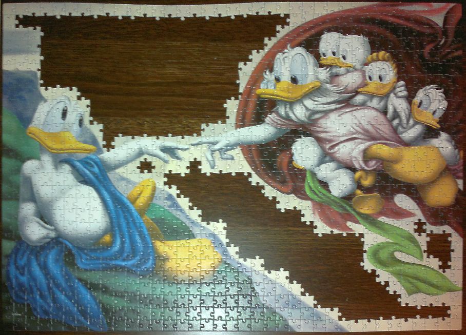 Как-то неожиданно получился совмещенный процесс сортировки и сборки. То есть, бралась деталька из коробки, если не фон - ставилась примерно на нужное место, если фон - отправлялась в другую коробку. В итоге к концу сортировки пазл без фона был собран.