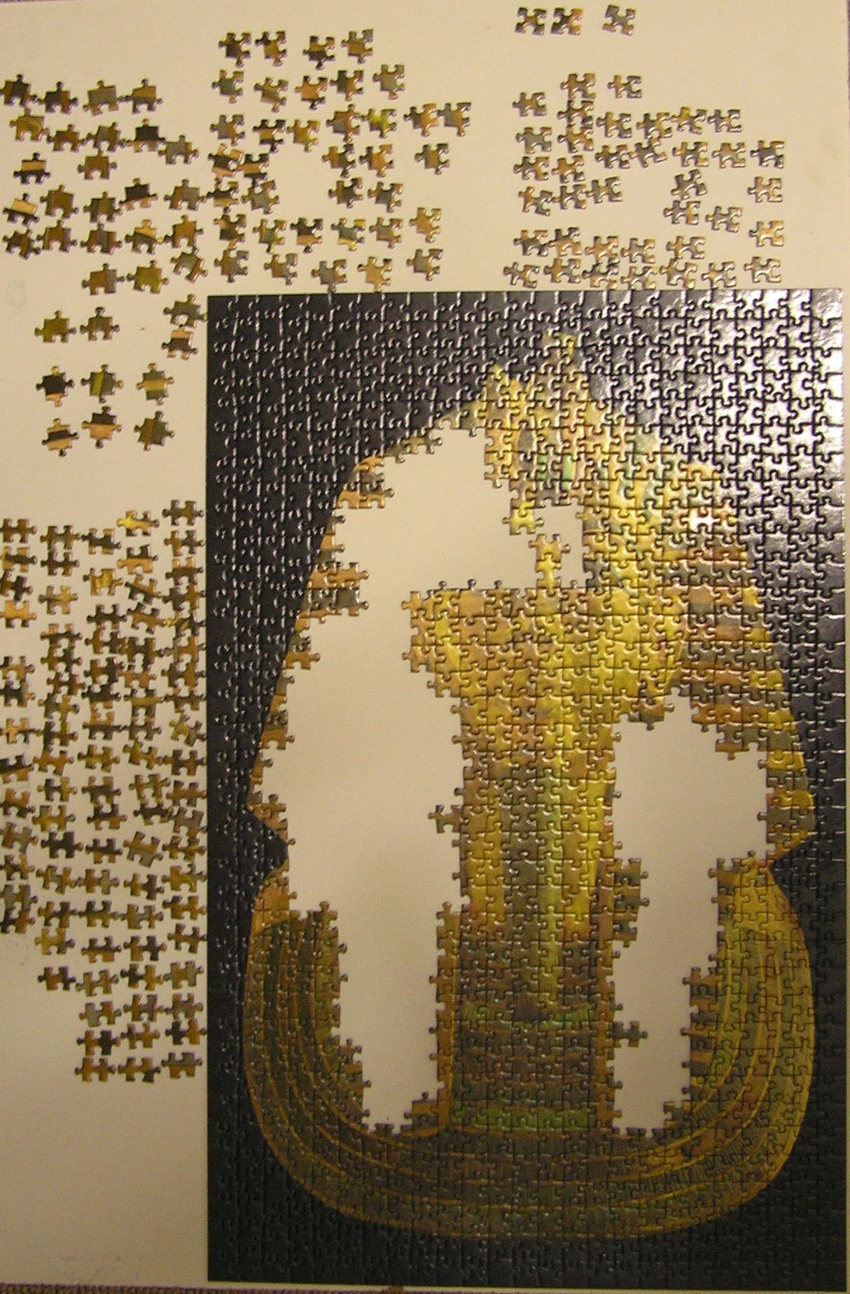 Ни разу не металлик :x Пазл покрыт тонким слоем фольги, от чего очень легко царапается :cry: Очень большое искажение цвета, причем под разным углом разное. Иногда помогает поляризация, но большую часть пришлось собирать перебором. Пазл для тех, кому не жалко свои глаза. Страшно представить сколько времени уйдет у человека не собиравшего до этого пазлы wacko
