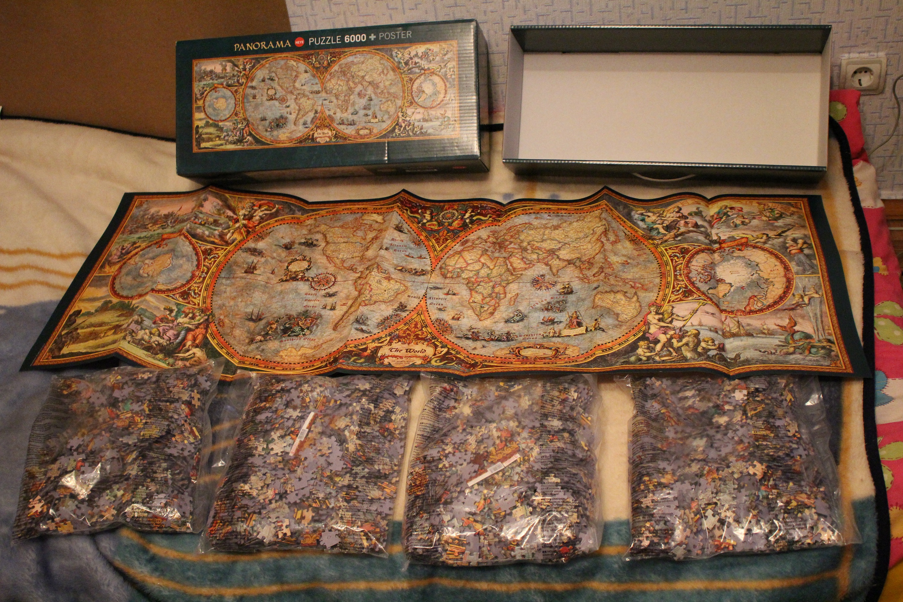 Разделен на 4 пакета по 1500 деталей, в комплекте постер.