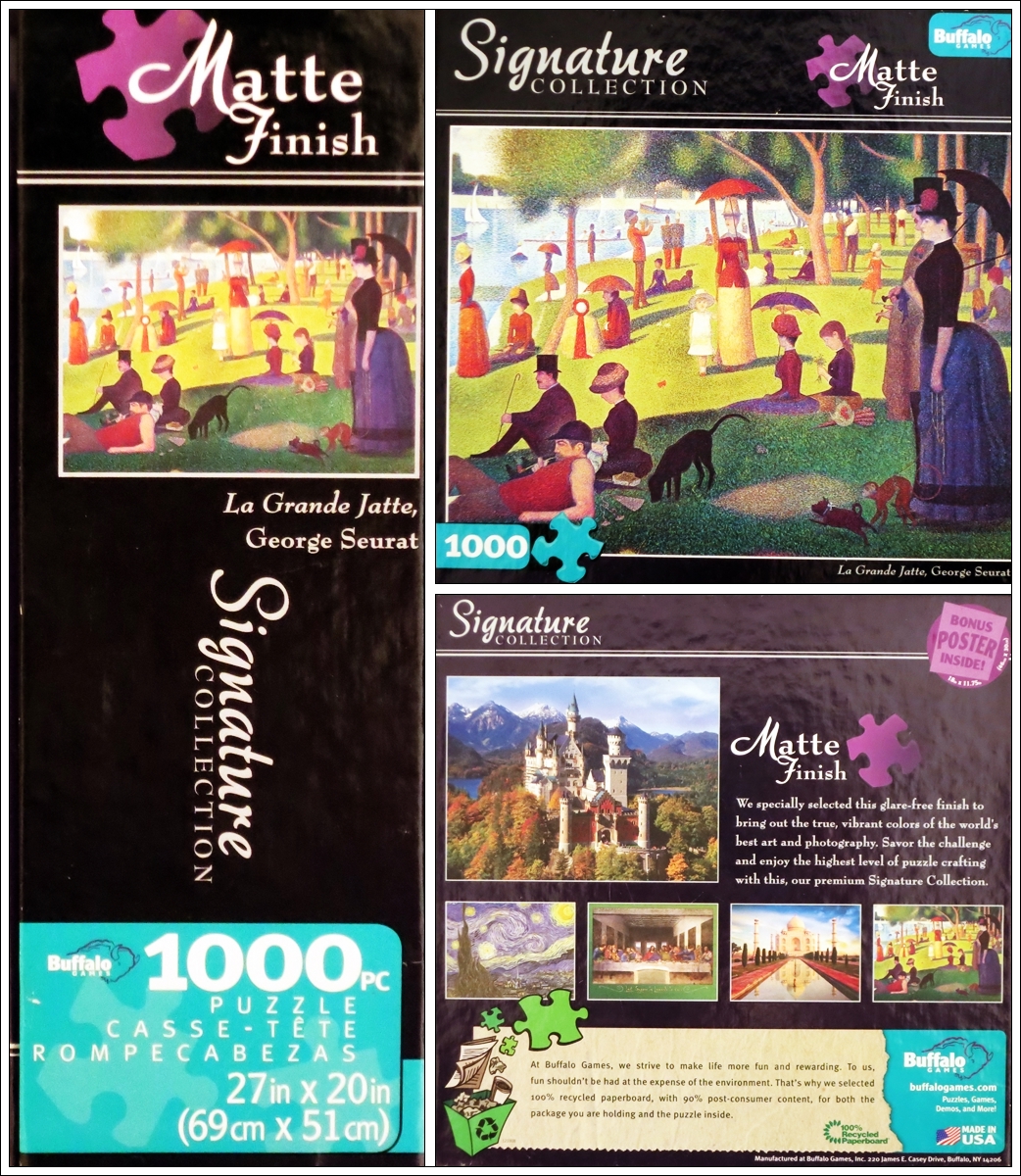 Пазл из серии Signature Collection назвали сокращенно, а на самом деле картина Жоржа Сёра называется не просто Гранд-Жатт, а именно "Воскресный день на острове Гранд-Жатт". Поскольку Сёра был основоположником пуантилизма, в основе которого лежит манера письма раздельными мазками правильной точечной или прямоугольной формы, то и пазл этот - сплошные точки, точки, точки... Жуть как интересно!!!