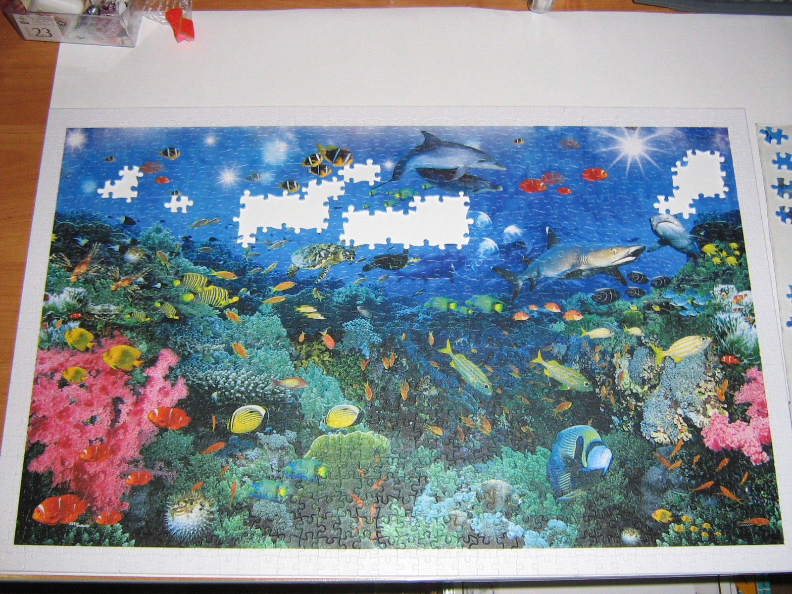 Начала сборку в понедельник. Минут за 5 собрала чудо-рамку из белых деталей. Мне так понравилось :)))) Потом за полчаса собрала красные водоросли и всё. Тупик. Психанула и разобрала его. Открыла Трефл на 1500. Господи, там все детали одного цвета. Ковыряла, ковыряла весь день. Еще больше бешенства и вдруг мысль "Ой, а пластик вроде легче был". Разобрала Трефл, достала пластик. И за три дооооолгих дня я одолела его :) Из минусов - маленький размер собранного пазла. Ну никак на 1000 не тянет. Скорее как 500 у Кастора. Из плюсов - это ПЛАСТИК! :)))) Прикольно.