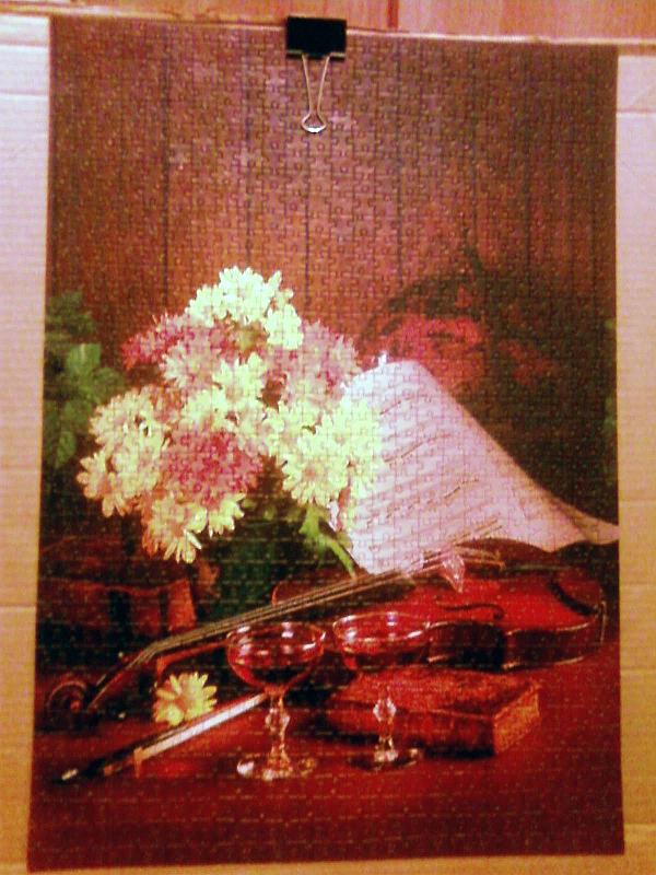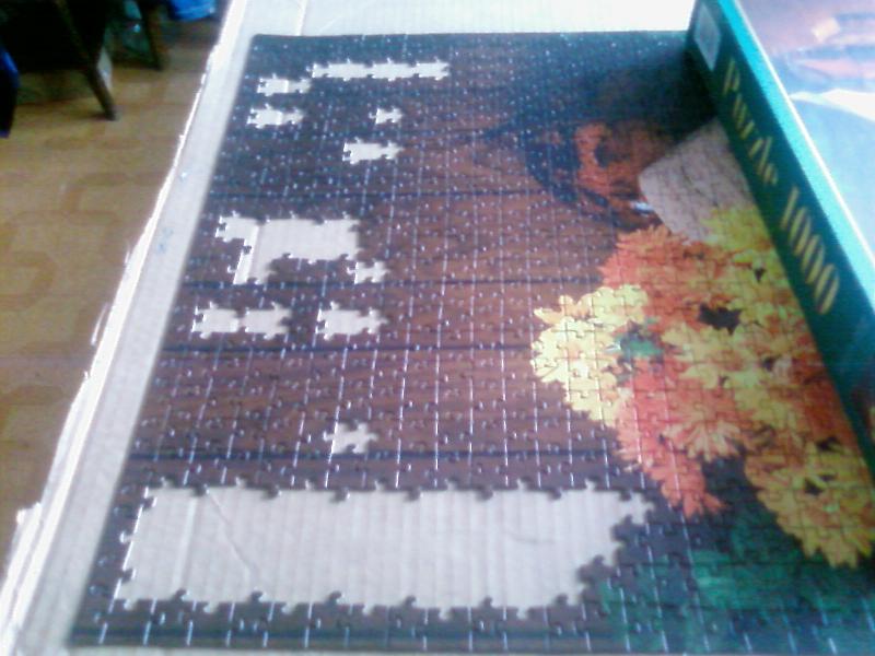 Пришлось собирать заново. И сразу садить на самоклейку. А сверху придется еще ПВА или лаком покрывать, потому что красочный слой такой хрупкий, что после всего двух сборок пазл выглядит обтрепанным как мои старички, раз по 5 собиравшиеся.