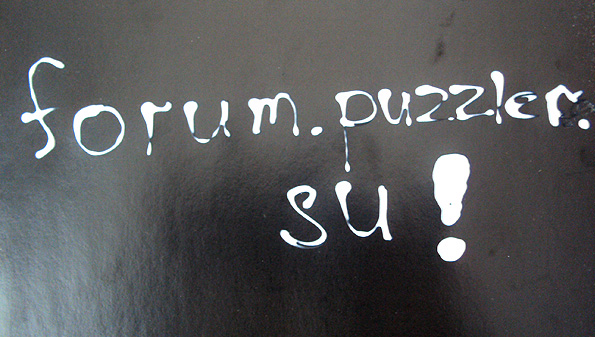 Намеренно лью на картонку много клея, особенно на восклицательный знак. Обратите внимание, в слове puzzler вместо буквы р английской нечаянно написала русскую, и после исправления остались небольшие разводы.