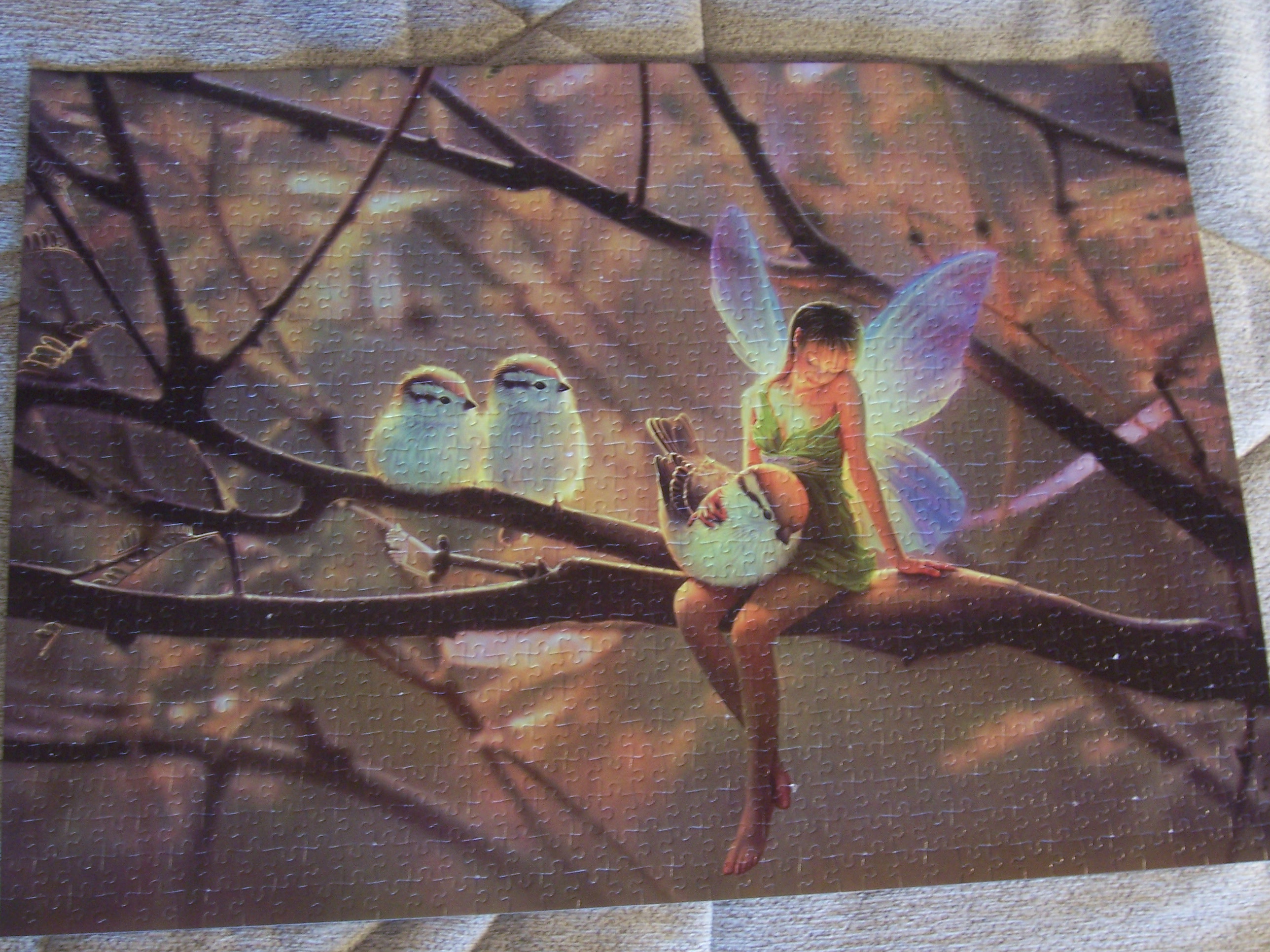 Вот он, достаточно долгий пазл. Собирала, наверное, недели две, фон давался тяжело: свет плохой, пазлинки бликуют, а ещё целыми частями встают не на своё место (видимо штамп одинаковый). Ошибку находила не сразу опять же из-за освещения.