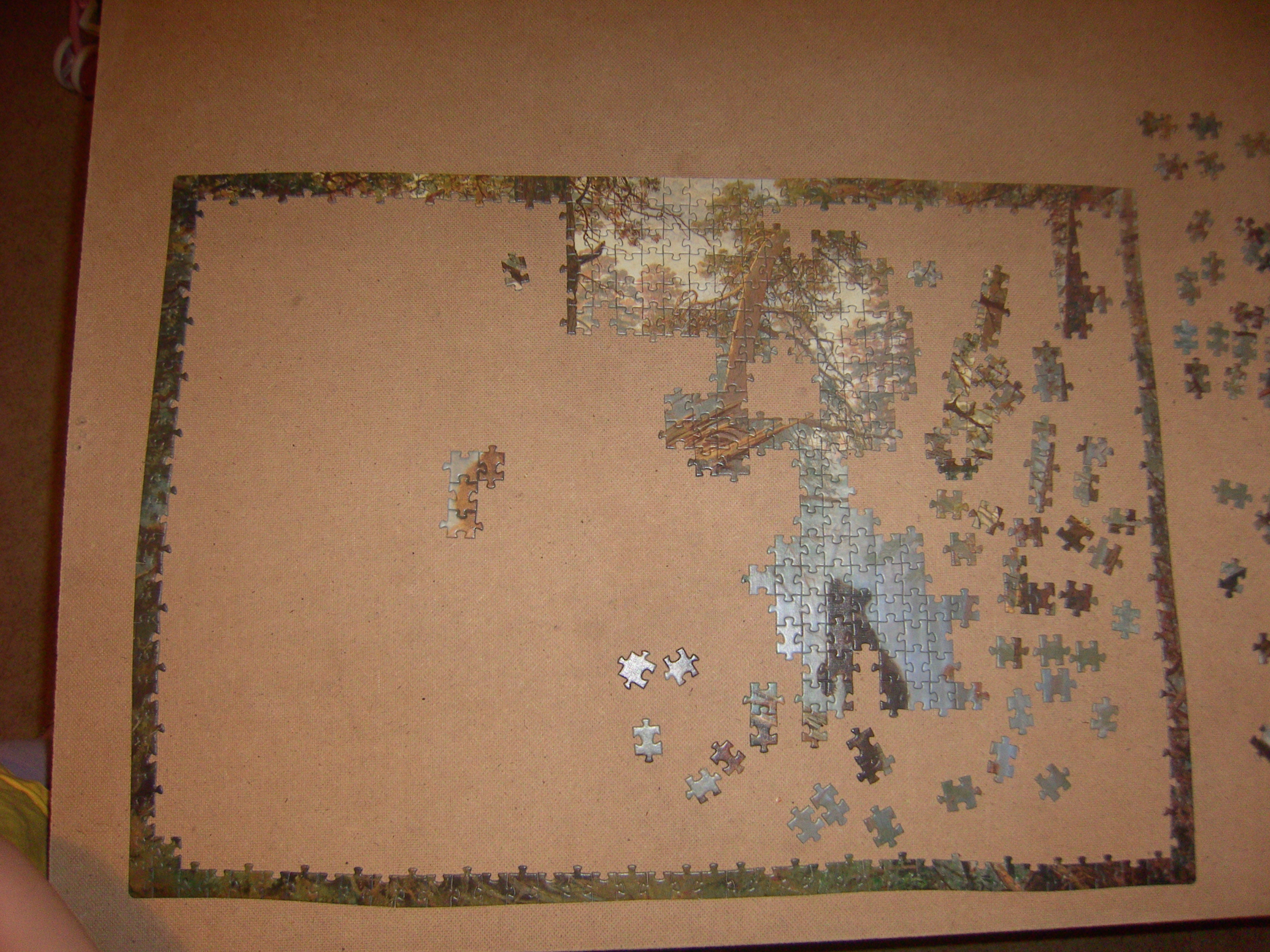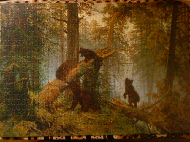 Собралась сложить картину - пока только рамку выложила, буду по ходу выкладывать. Сортировка нудная - детальки лишь немногие четко можно определить в ту или иную группу. Ещё досаднее от того, что картина кажется маленькой, а прямо перед местом для сборки висит более солидная картина. Даже с чего начать не знаю - получается как у многих с белых просветов в верхушках деревьев.