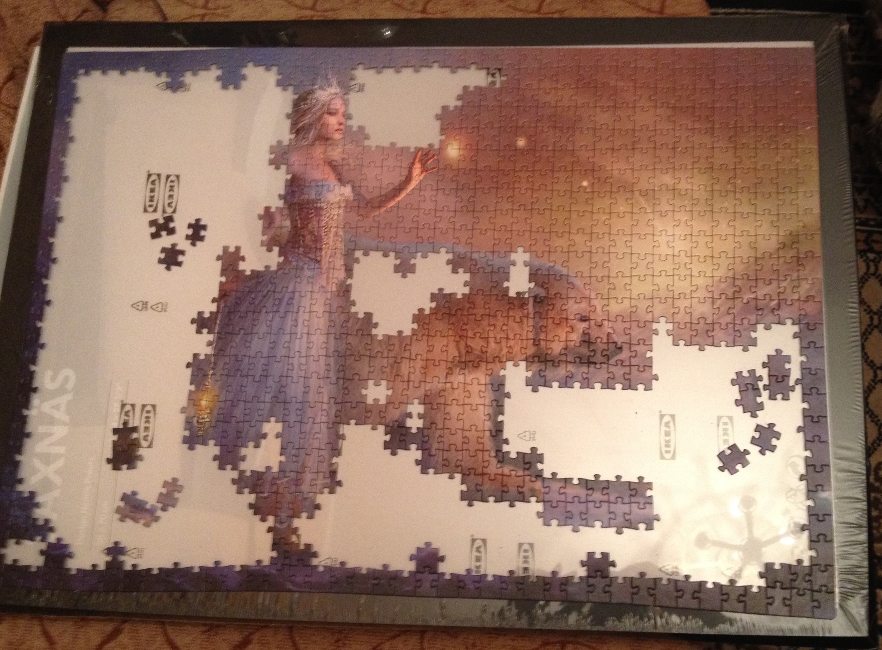 Вообще впечатление негативное прошло, в целом неплохо, только вот сцепку бы изменили. А то последний пятачок несколько раз пересобирала, ибо влазию детальки куда угодно, а градация цвета при искусственном освещении просто жуть какая неразличимая. Вот итог, правда видны разводы от клея, пока не подсох, потом выложу еще и в рамке. А так детальки приятные на ощупь и в целом приятная полиграфия, и конечно цена