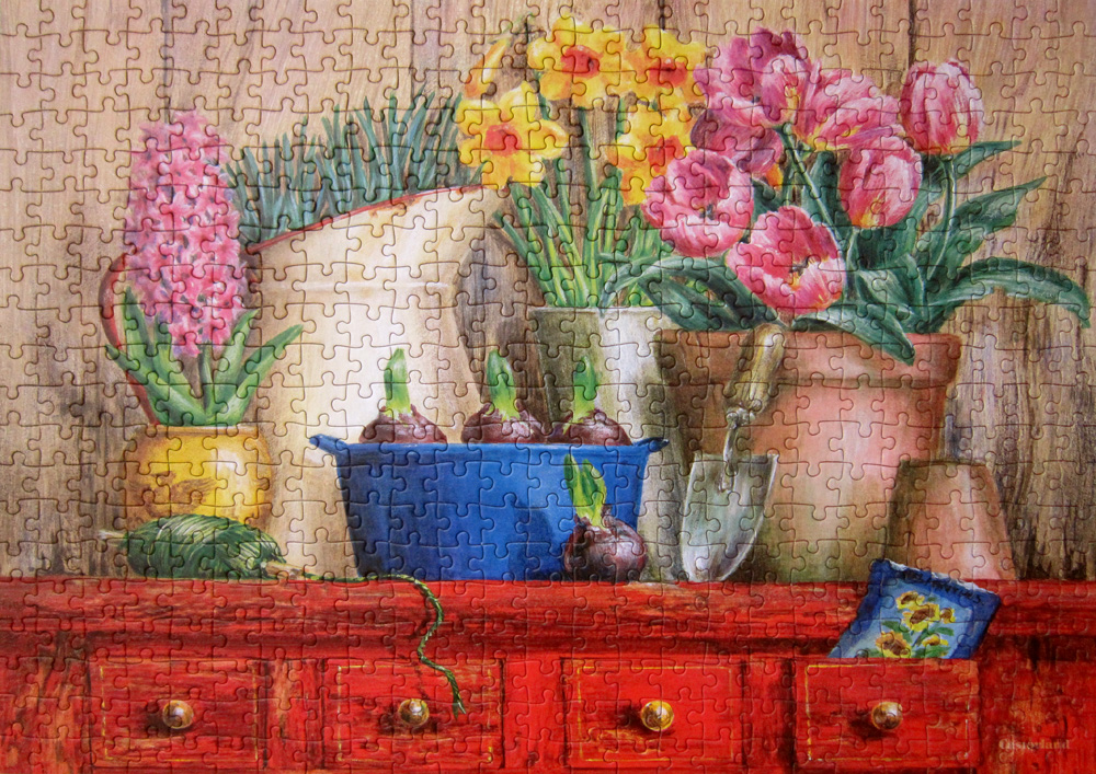 Прекрасный пазлик. Собрала сегодня, когда у нас за окном целый день льет дождь. А у меня расцвели красивые весенние цветы.