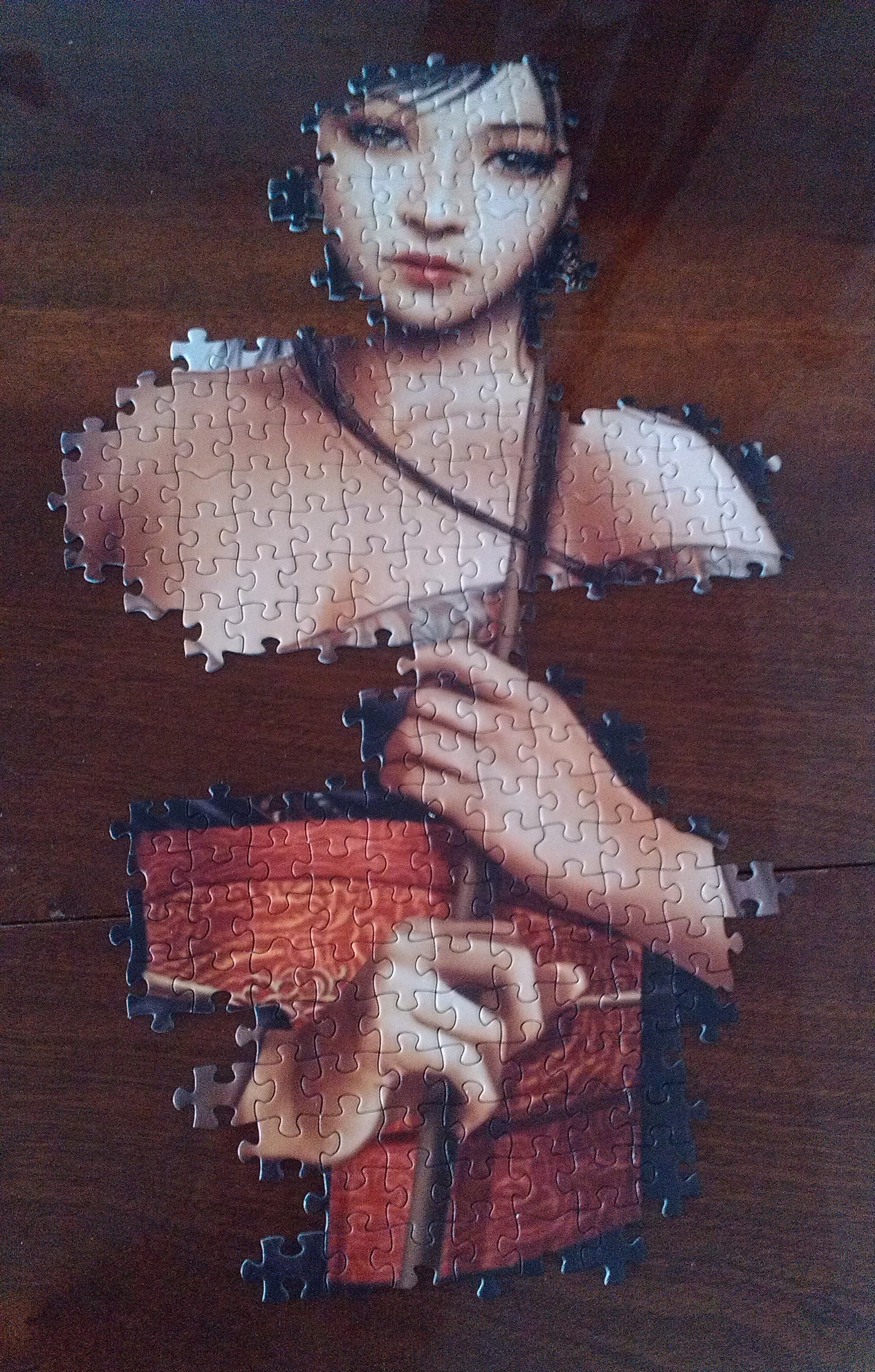 Прочитав, просчитав и немного обалдев от размера пазла, решил, что как раз на раскладной большой стол он вполне так поместится. Чтобы в этом удостовериться, да и просто потому, что люблю собирать сначала рамку... правильно. Собрал рамку: Решив не стандартно подойти к началу сборки, собрал девушку. Не всю. Исключительно чтобы поговорить во время остального, как я думал, достаточно скучного сбора фона. Фото: После двух дней перерыва, настал: