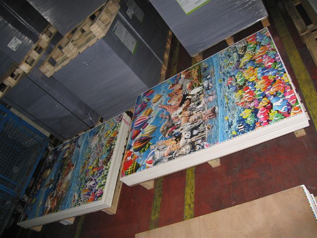 Дальше проходим через склады, на которых хранятся уже отпечатанные картонки с пазлами (не разрезанные).