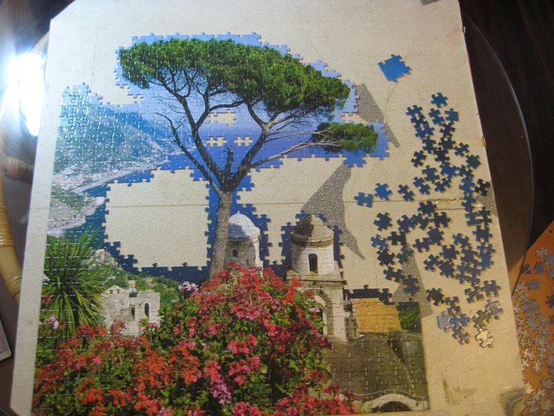 Сборку начала с дерева, потом нижнюю часть с цветами и пейзажем, на десерт оставила пазломоре. после того, как позади была сборка пёстрых цветовых пятен и прошла она очень бодренько, все оттенки синего были уже не страшны Море собралось вообще буквально минут за 20, потому как тёмно-синий легко узнаваем по различным оттенкам и его меньше, чем неба, а вот с небом пришлось попыхтеть, но собирался он тоже в неснижаемом темпе. Единственной проблемой была глянцевая поверхность - очень бликовала от лампы.