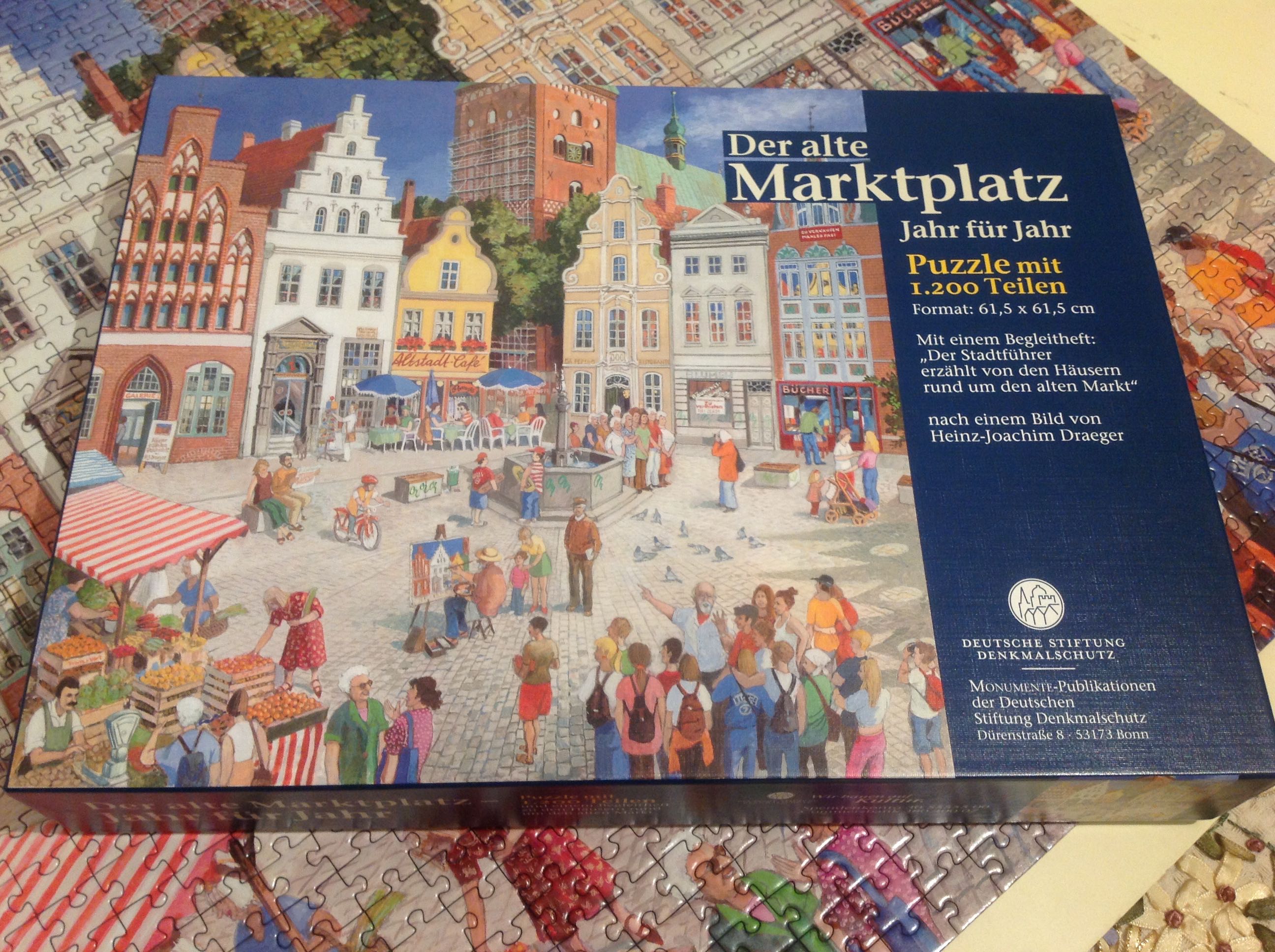 Немецкий фонд охраны памятников выпускает вот пазлы. К пазлу прилагается небольшая книжечка о том, как эта плащадь выглядела в разные испорические эпохи. Пазл отличного качества, немного пиатник напоминает. Сцепка отличная. Из недостатков - было чуть-чуть пыли. Приятная нарезка и нестандартный размер пазла - квадратный.