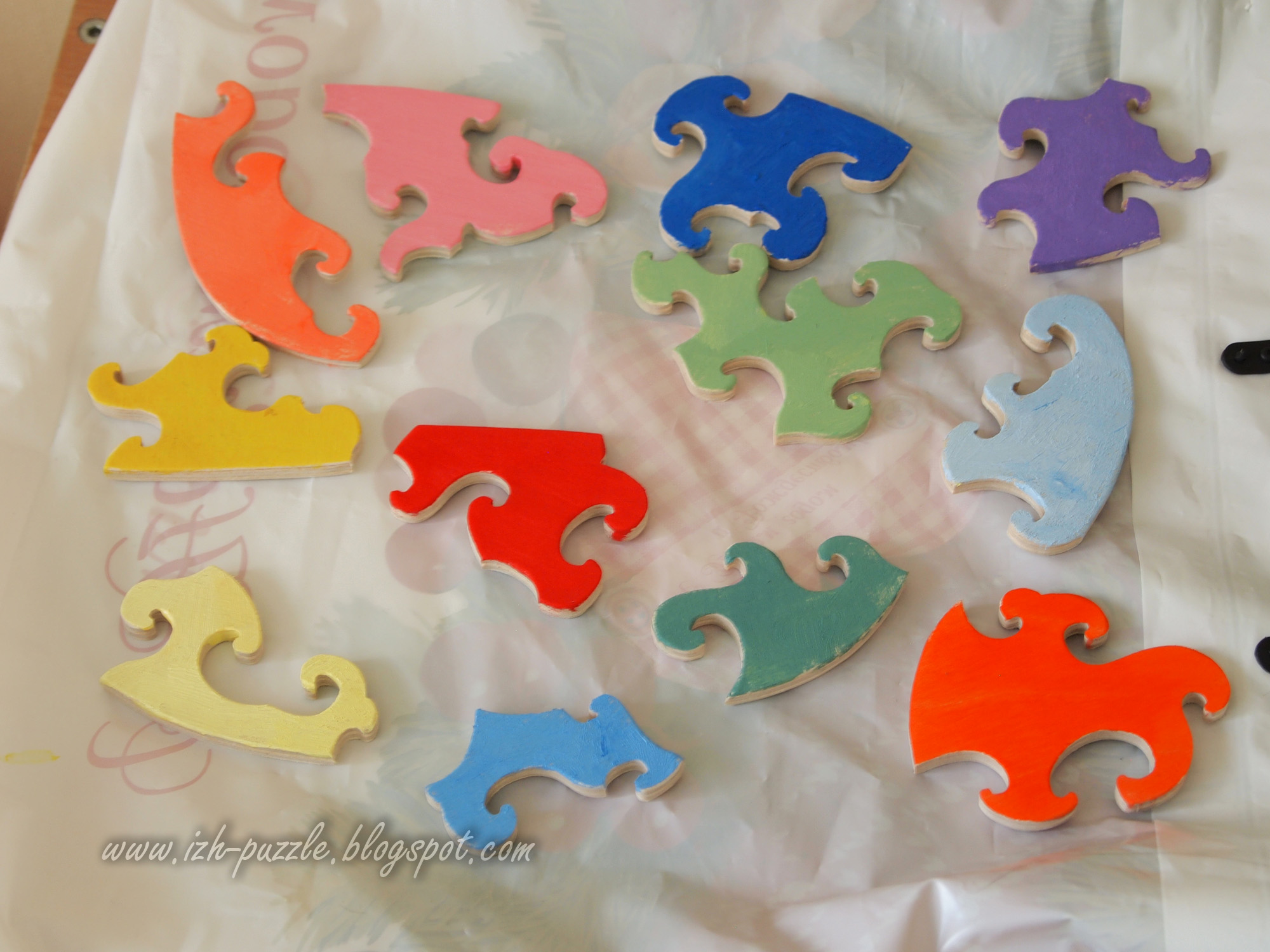 Развлекались с семилетней дочкой, сделали пазлик на конкурс валентинок. За мной - резка, за ней - цвет. Размер примерно 18*15см, 13 деталей, акриловая краска.
