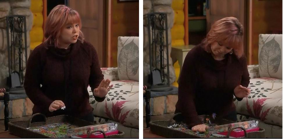 Следующий кадр, мы видим в руках у нее дведырочную "спинку". (Придираться про то, что в кадре еще три спинки уже не стоит, хотя и в кадре 1 видно, что у нее не собран только фиолетовый кусок слева).