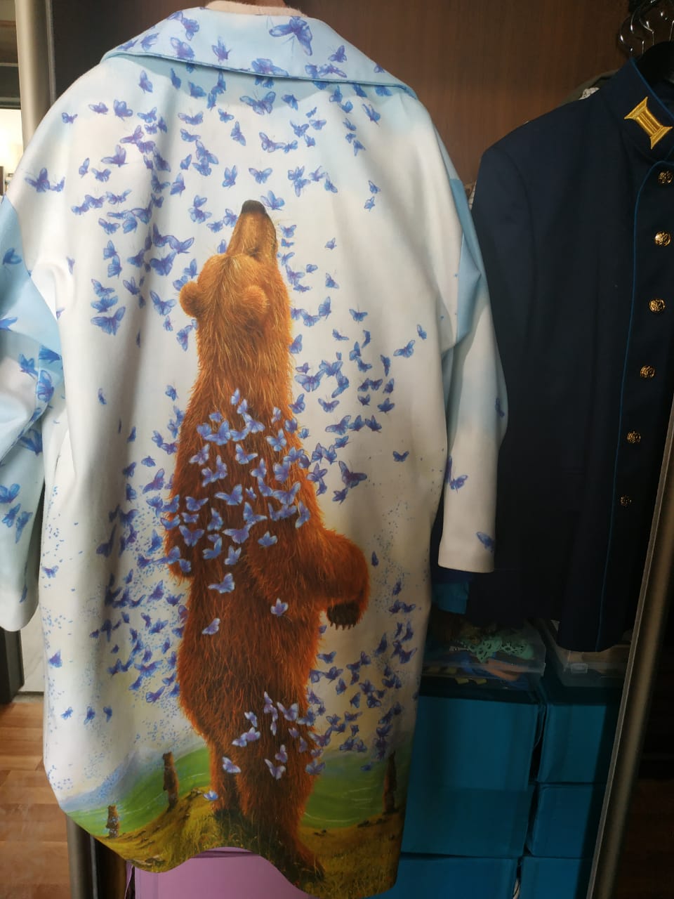 И вот что написано на коробке: Медведи во вселенной Роберта Биссела ведут сложную жизнь, полную неких мыслей, совсем как люди.Они иногда веселятся, иногда задумываются, погружаясь в мир, ведомый только им. На этой картине шестеро медведей окружены сотнями кружащихся синих бабочек. Медведям просто любопытно? Или они размышляют о таинственности природы? Но они слишком зачарованы, чтобы ответить на эти вопросы.