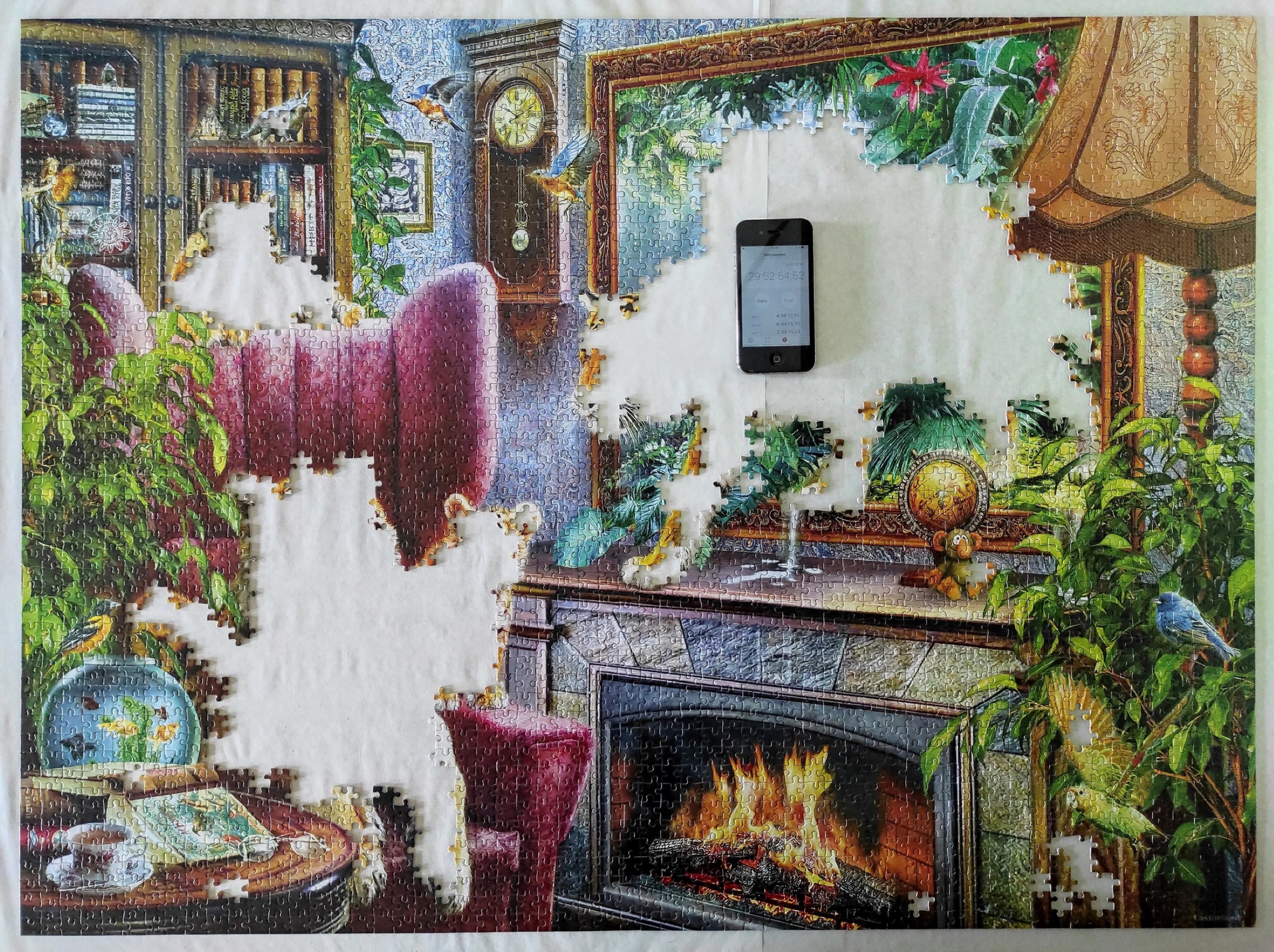 80% готово. Обычно зелень собираю в самом конце, но тут её было не очень много, осталось буквально 100 деталек фона и всё остальное это тигры. Общее время 29 часов 52 минуты.